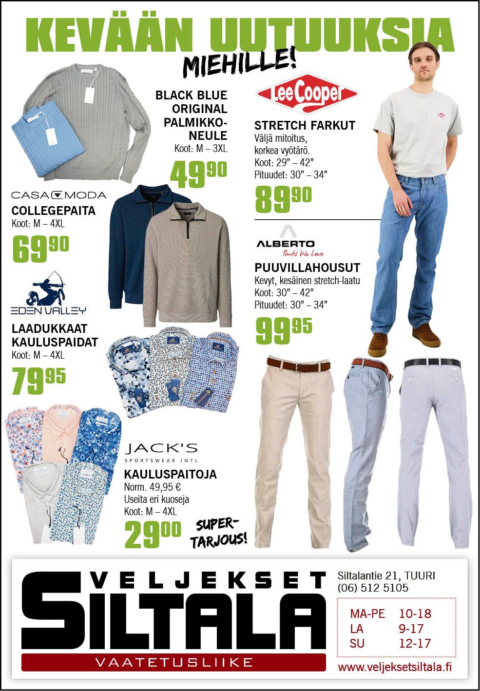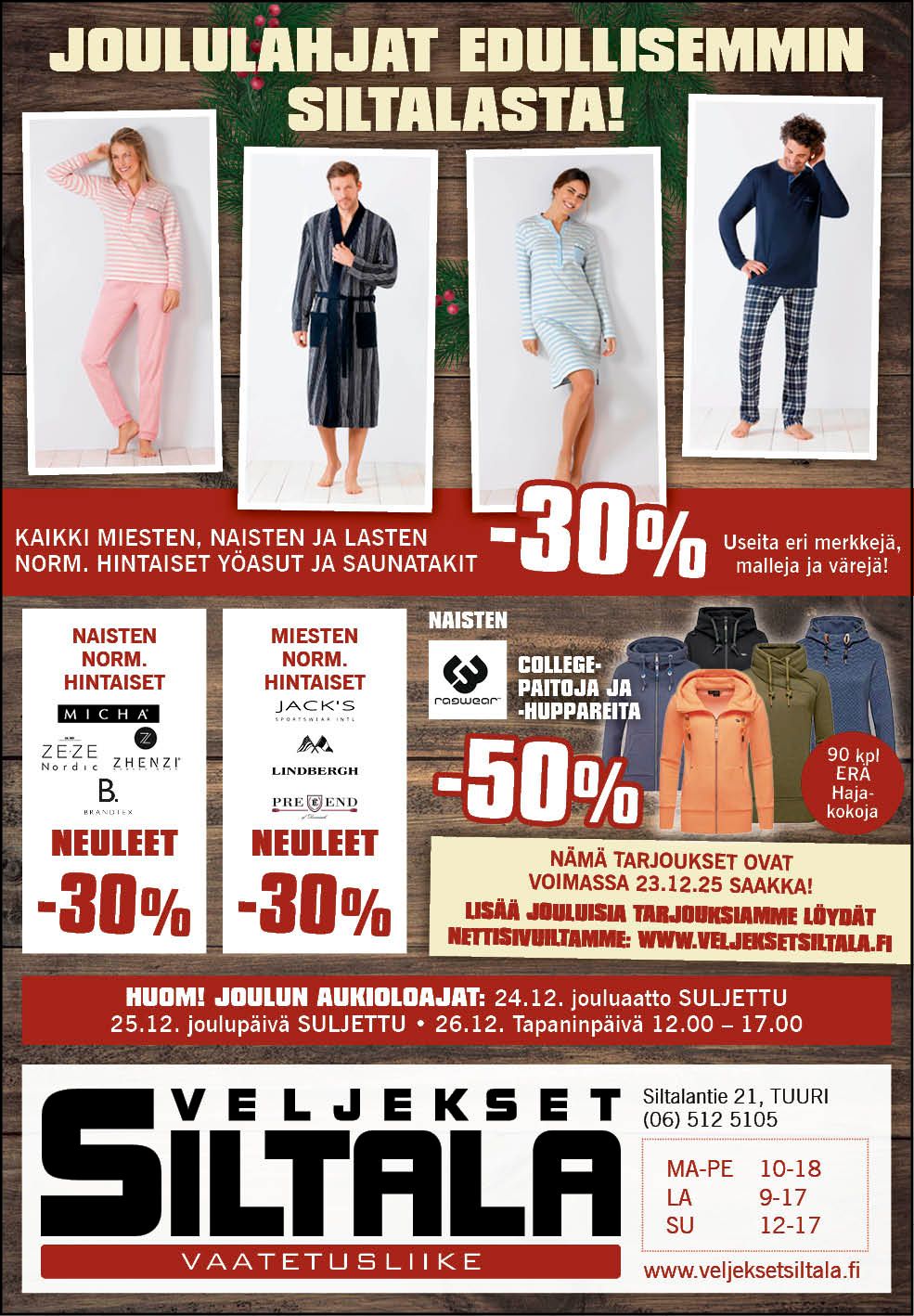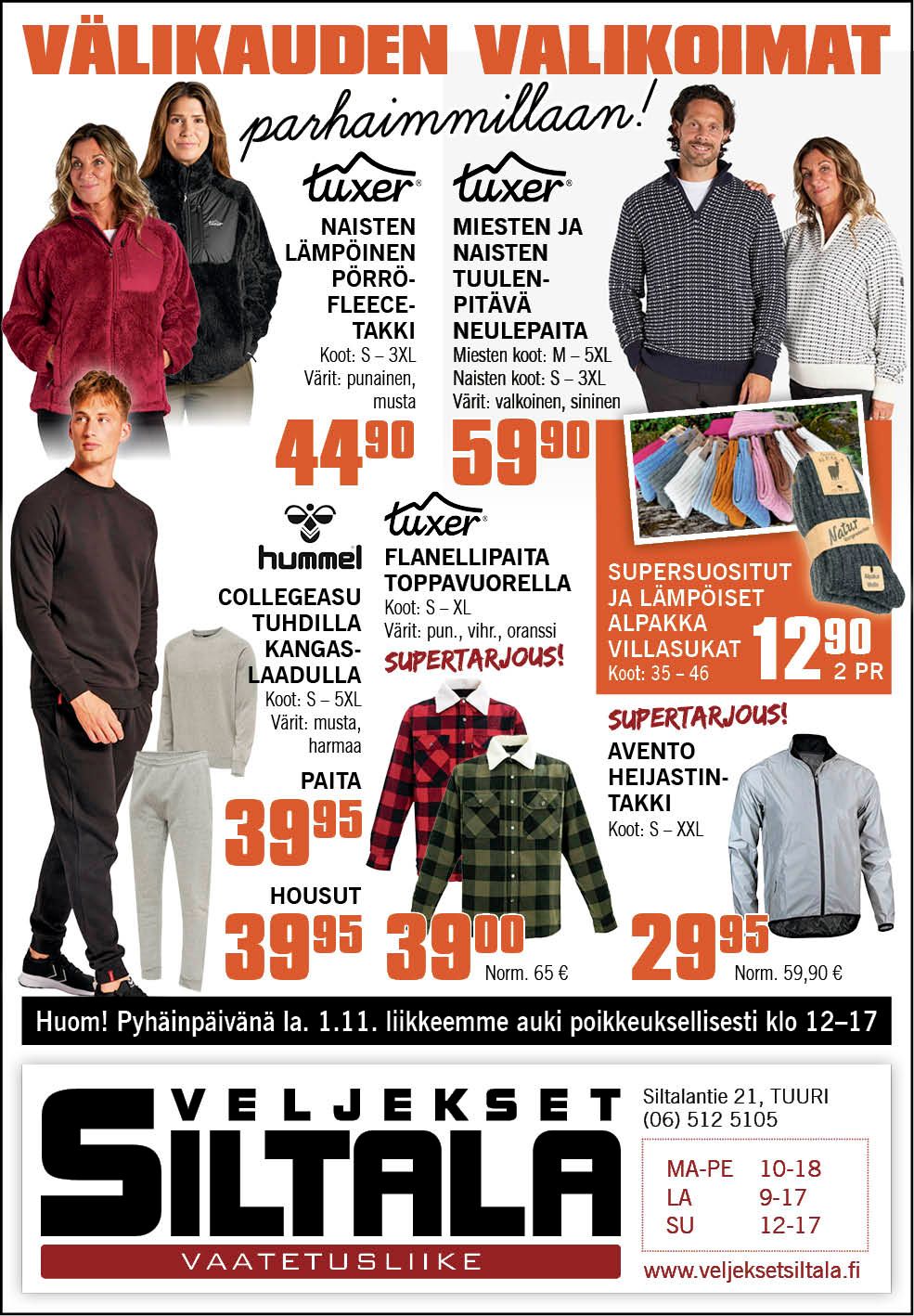 Tervetuloa Veljekset Siltalan vaatekauppaan, joka sijaitsee aivan maankuulun Veljekset Keskisen kyläkaupan naapurissa Tuurissa. Meiltä löydät aina ajankohtaiset tarjoukset Tuurin parhaista vaatteista, kengistä ja asusteista koko perheelle. Valikoimamme vaihtuu kauden mukaan, joten tarjouksistamme löydät aina jotain uutta ja tyylikästä – edullisesti.