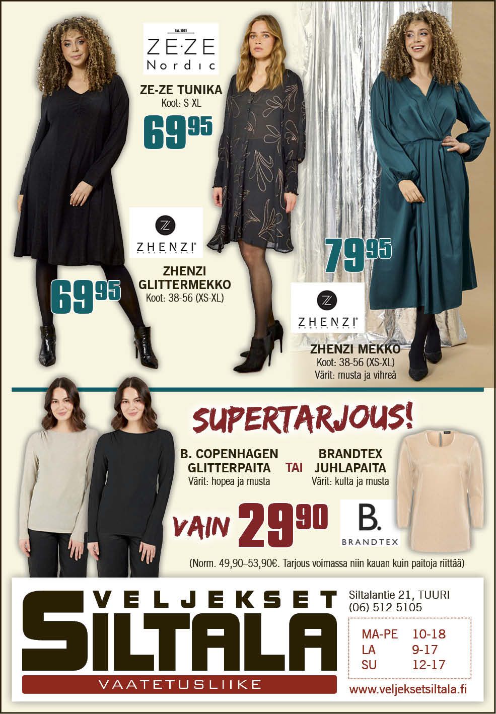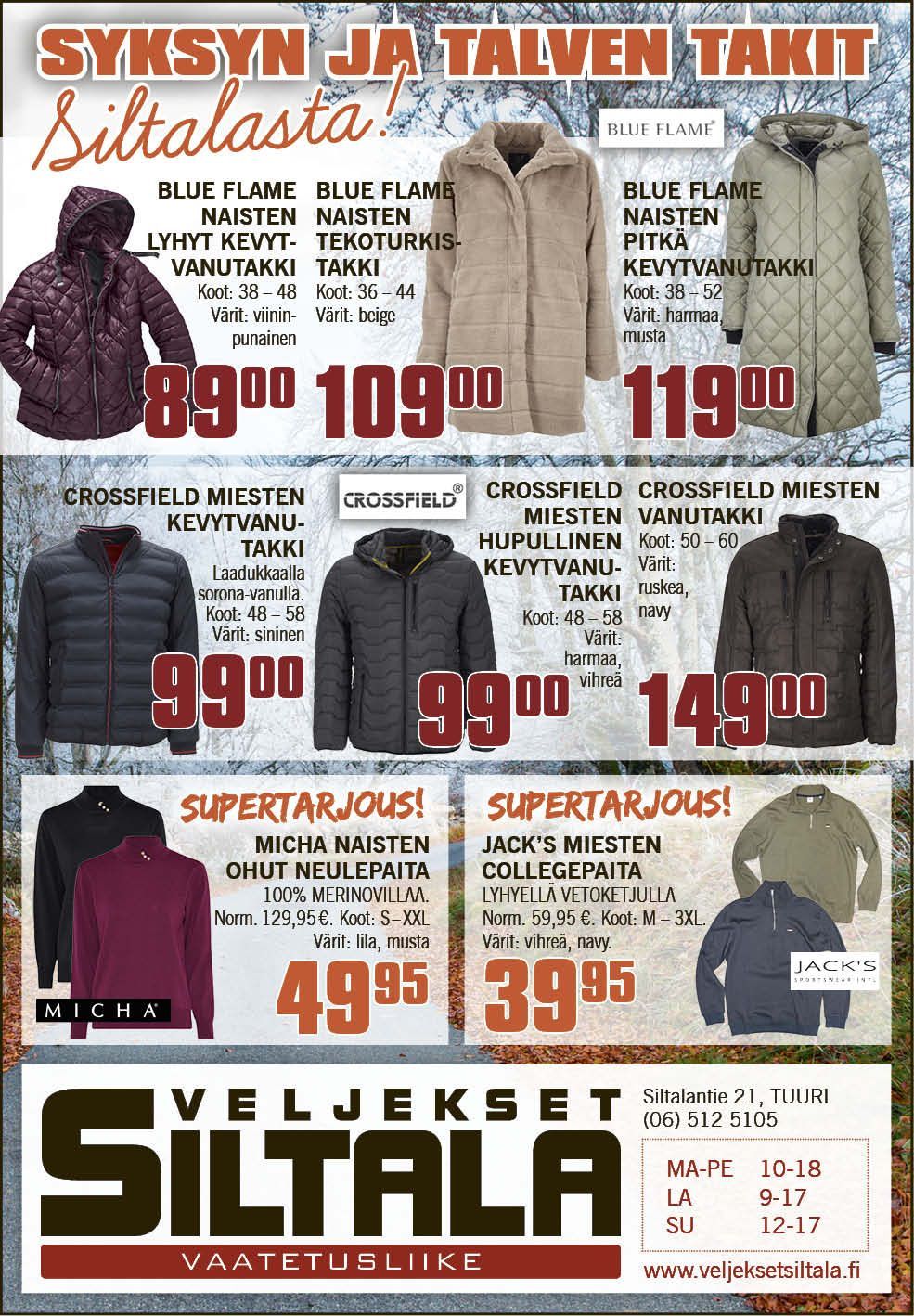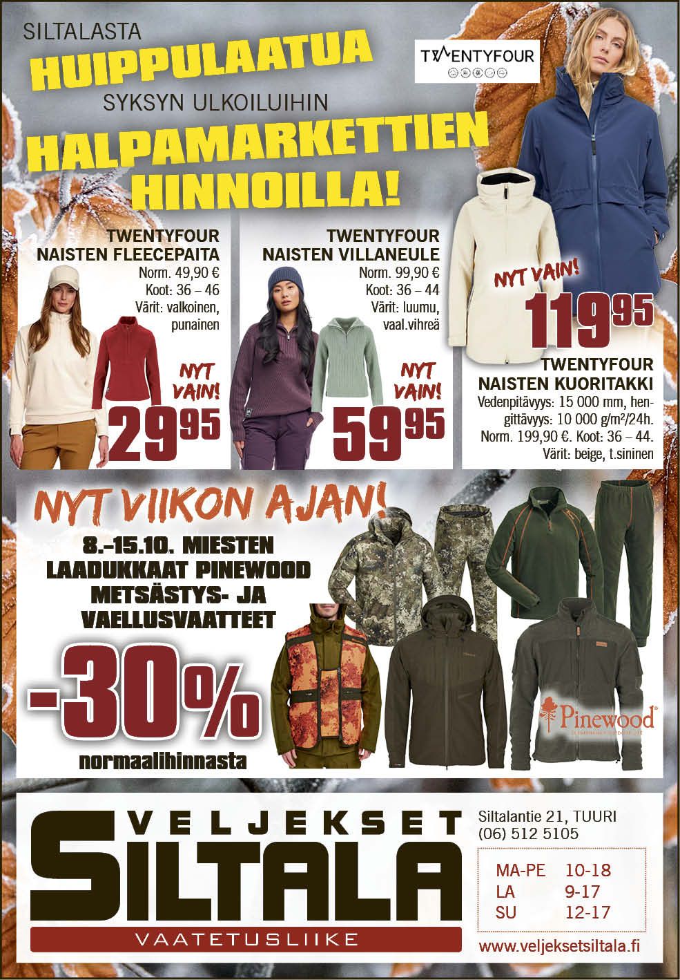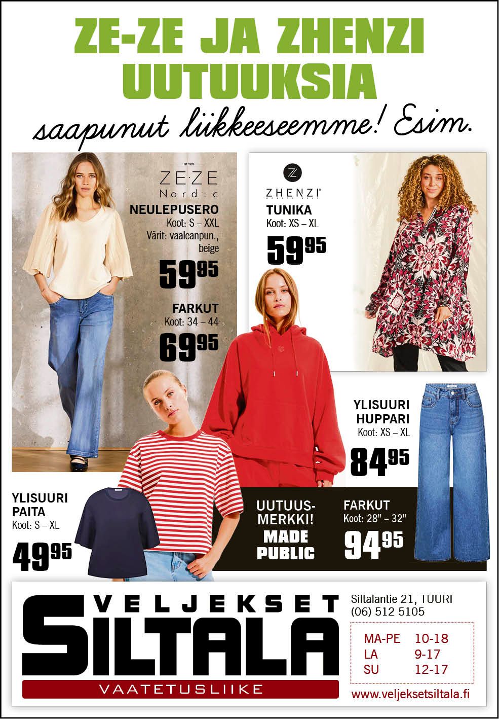 Tervetuloa Veljekset Siltalan vaatekauppaan, joka sijaitsee aivan maankuulun Veljekset Keskisen kyläkaupan naapurissa Tuurissa. Meiltä löydät aina ajankohtaiset tarjoukset Tuurin parhaista vaatteista, kengistä ja asusteista koko perheelle. Valikoimamme vaihtuu kauden mukaan, joten tarjouksistamme löydät aina jotain uutta ja tyylikästä – edullisesti.
